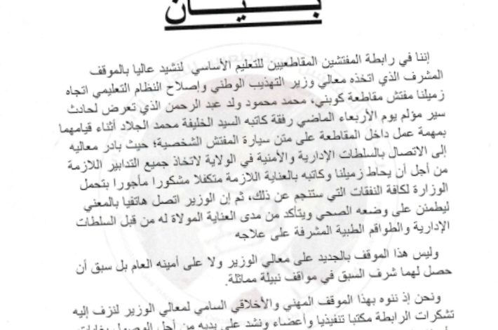 أكمل القراءة »قالت وزارة التهذيب الوطني وإصلاح النظام التعليمي في بيان لها إنها تكفلت بعلاج مفتش مقاطعة كوبني محمد محمود ولد عبد…