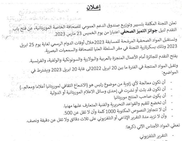 أكمل القراءة »أعلنت اللجنة المكلفة بتسيير وتوزيع صندوق الدعم العمومي للصحافة الخاصة الموريتانية، عن فتح باب التقدم لنيل جوائز التميز الصحفي اعتبارا…