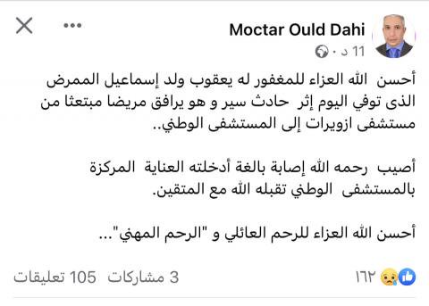 وكتب الوزير على حسابه بالفيسبوك “أحسن الله العزاء للمغفور له يعقوب ولد إسماعيل الممرض الذى توفي اليوم إثر حادث سير و هو يرافق مريضا مبتعثا من مستشفى ازويرات إلى المستشفى الوطني..