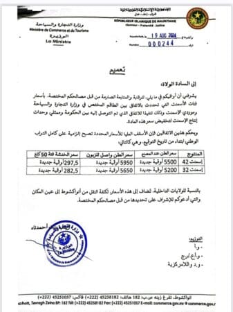 ويقضي التعميم بمراقبة سعر الأسمنت المحدد بـ 5950 أوقية جديدة للطن واصلة للزبون عن نوعية 42 وسعر 5650 عن نوع 32.