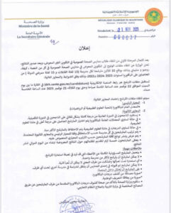 تستقبل ملفات الترشح عبر رابط المنصة الإلكترونية (drh.sante.gov.mr/candidature) في الفترة ما بين يوم الجمعة 22 نوفمبر عند الساعة الثامنة صباحا ويوم الثلاثاء 25 نوفمبر 2025 عند الساعة الخامسة مساء.