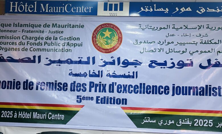 تنظم اللجنة المكلّفة بتسيير موارد صندوق الدعم العمومي لوسائل الاتصال، اليوم الخميس 26 ديسمبر 2025، بفندق موريسانتر في نواكشوط، حفل توزيع جوائز التميز الصحفي في نسخته الخامسة، بحضور مسؤولين وفاعلين في الحقل الإعلامي.