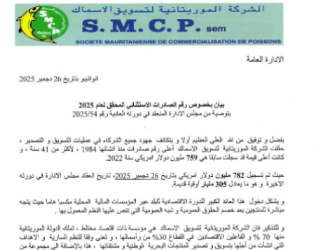 أعلنت الشركة الموريتانية لتسويق الأسماك أن قيمة صادراتها بلغت حتى ديسمبر الجاري نحو 782 مليون دولار، ما يعادل 305 مليارات أوقية قديمة، مع توقعات بتجاوز حاجز 800 مليون دولار قبل نهاية العام، في سابقة هي الأولى منذ تأسيس الشركة قبل 41 عامًا.