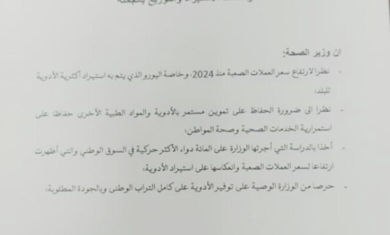 الوزارة أوضحت أن الإجراء يستند إلى ارتفاع وتذبذب أسعار العملات الصعبة منذ 2024، خصوصاً اليورو المعتمد في استيراد معظم الأدوية. وأظهرت دراسة شملت 100 دواء الأكثر تداولاً تأثراً مباشراً بتغيرات سعر الصرف.