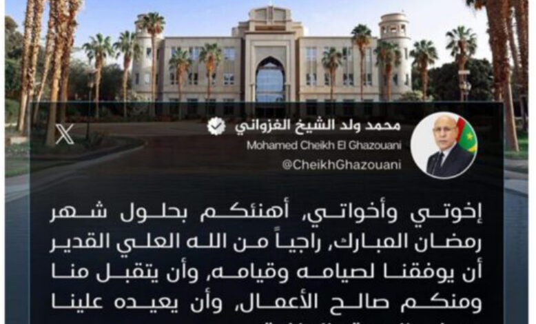 توجه فخامة رئيس الجمهورية، محمد ولد الشيخ الغزواني، برسالة تهنئة إلى الشعب الموريتاني بمناسبة حلول شهر رمضان المبارك، معبّراً عن أصدق تمنياته بأن يكون شهر خير وبركة على الجميع.