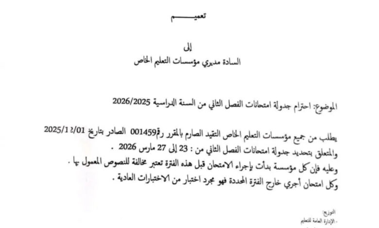 أبلغت وزارة التربية وإصلاح النظام التعليمي مديري مؤسسات التعليم الخاص بضرورة الالتزام بالجدولة الرسمية لامتحانات الفصل الثاني من العام الدراسي 2025-2026، وفق المقرر رقم 001459 الصادر بتاريخ 1 ديسمبر 2025.