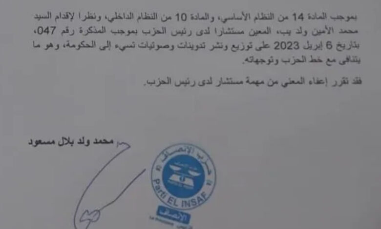 وشددت الوثيقة على أن هذه التصرفات لا تنسجم مع الانضباط الحزبي، مؤكدة أن القرار يدخل حيز التنفيذ فورًا، ويقضي بإنهاء مهام ولد يب كمستشار لدى رئيس الحزب.