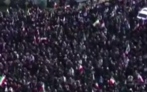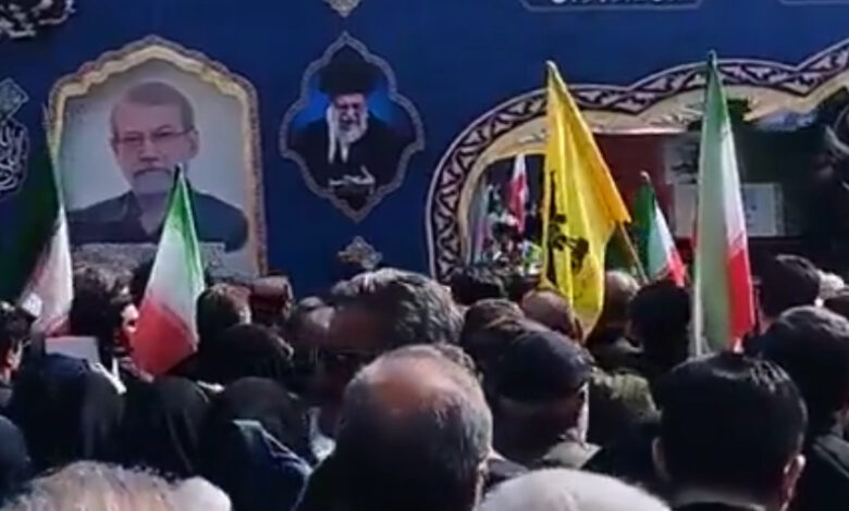 وأظهرت لقطات بثها التلفزيون الإيراني حشوداً كبيرة تجمعت في ساحة انقلاب وسط طهران، حيث رفع المشاركون الأعلام الإيرانية ورددوا هتافات، فيما حمل آخرون صور لاريجاني وغلام رضا سليماني، قائد قوات الباسيج شبه العسكرية، الذي قُتل أيضاً في الغارة نفسها.