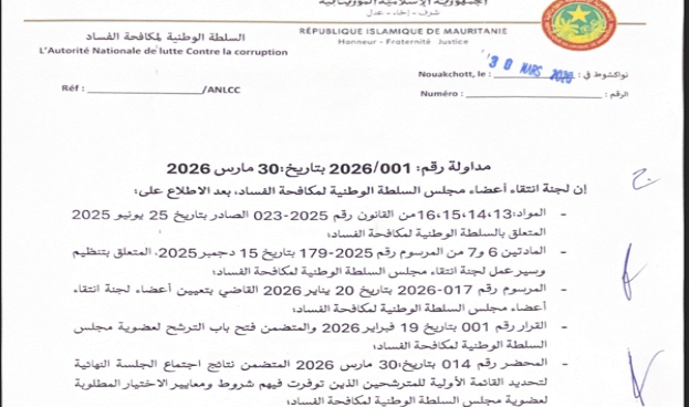 أقرت لجنة الانتقاء اللائحة الأولية للمترشحين لعضوية مجلس السلطة الوطنية لمكافحة الفساد، بعد اعتماد 29 اسماً استوفوا معايير التقييم في مجالات القانون والاقتصاد والمالية وتخصصات ذات صلة.