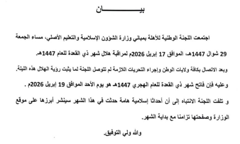 أعلنت اللجنة الوطنية للأهلة، مساء الجمعة، عدم ثبوت رؤية هلال شهر ذي القعدة لعام 1447هـ، مؤكدة أن يوم السبت سيكون مكمّلًا لشهر شوال، فيما يُرتقب أن يكون الأحد هو بداية الشهر الجديد.