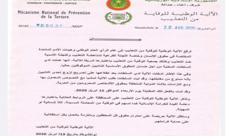 تابعت الآلية الوطنية للوقاية من التعذيب وضعية نائبين موقوفين، مؤكدة حرصها على ضمان احترام حقوقهما الأساسية ضمن مهامها الرقابية والتزامات موريتانيا الحقوقية.